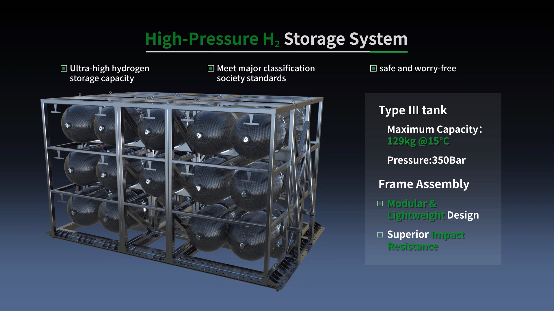 Na parte traseira do contêiner, localizado na popa da embarcação, estão instalados 14 tanques de armazenamento feitos de fibra de carbono que, juntos, comportam cerca de 129 kg de gás hidrogênio comprimido, sendo aproximadamente 9 kg por cilindro. A embarcação pode ser abastecida por ambos os lados, facilitando a operação e garantindo maior flexibilidade logística, já que o hidrogênio é adquirido de fornecedores especializados. Esses tanques são responsáveis por armazenar e fornecer o combustível limpo que alimenta todo o sistema elétrico do barco.