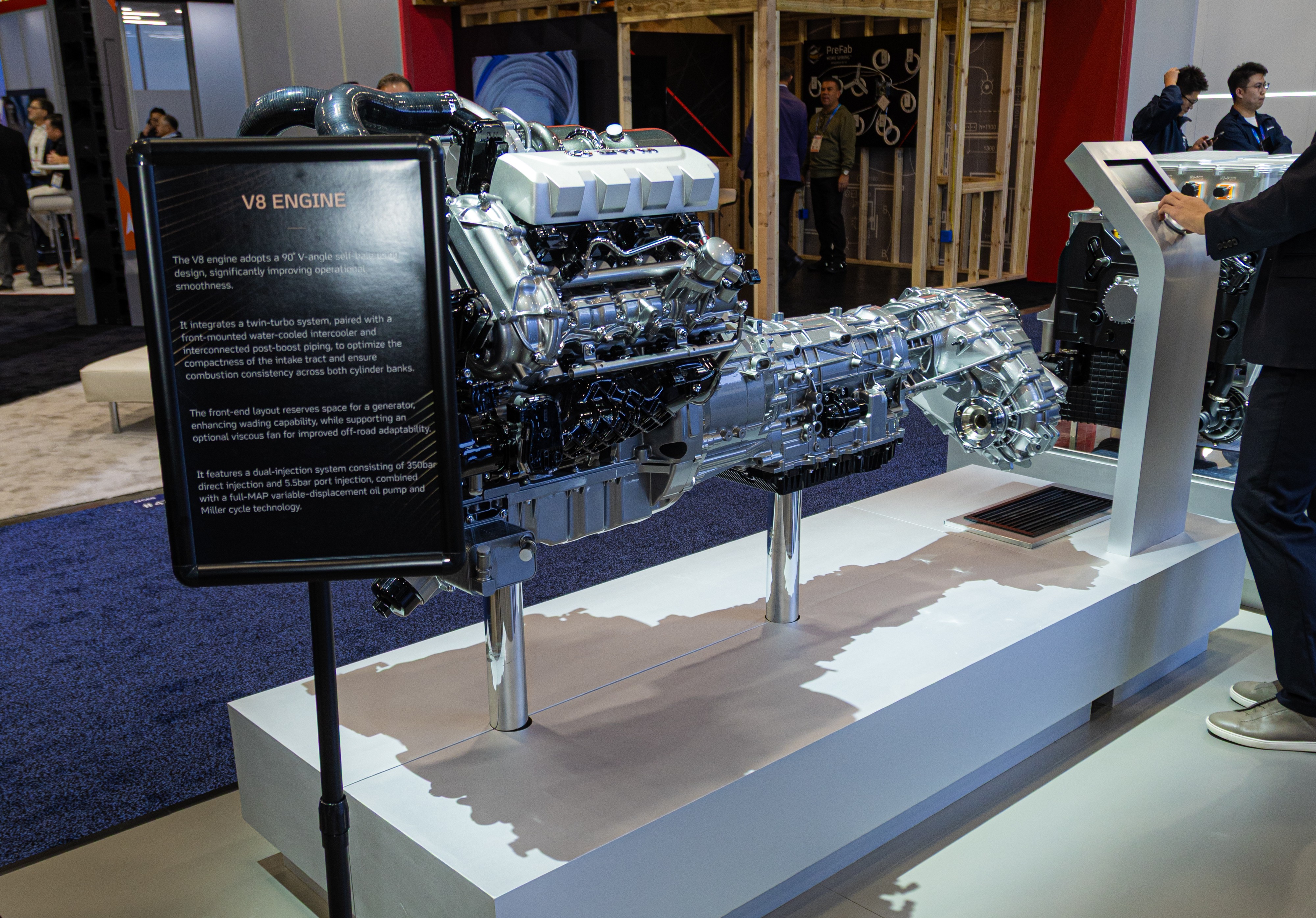 A abordagem multienergia da GWM inclui soluções que vão além da eletrificação. O estande apresenta o novo motor V8 hibrido, desenvolvido para equilibrar desempenho, eficiência e conforto acústico, com compatibilidade com diferentes arquiteturas, incluindo plataformas híbridas.