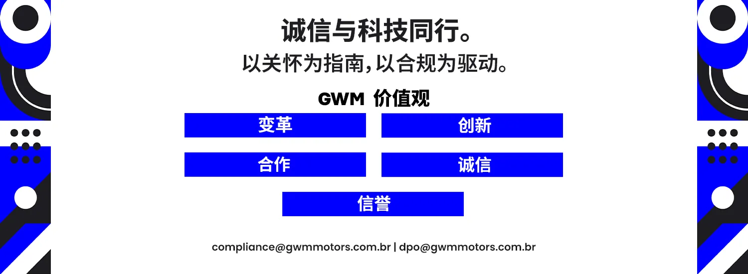 本页面为GWM巴西官方网站的组成部分。如需通过道德频道进行举报,请点击本页面底部或GWM网站首页的"道德频道"入口。